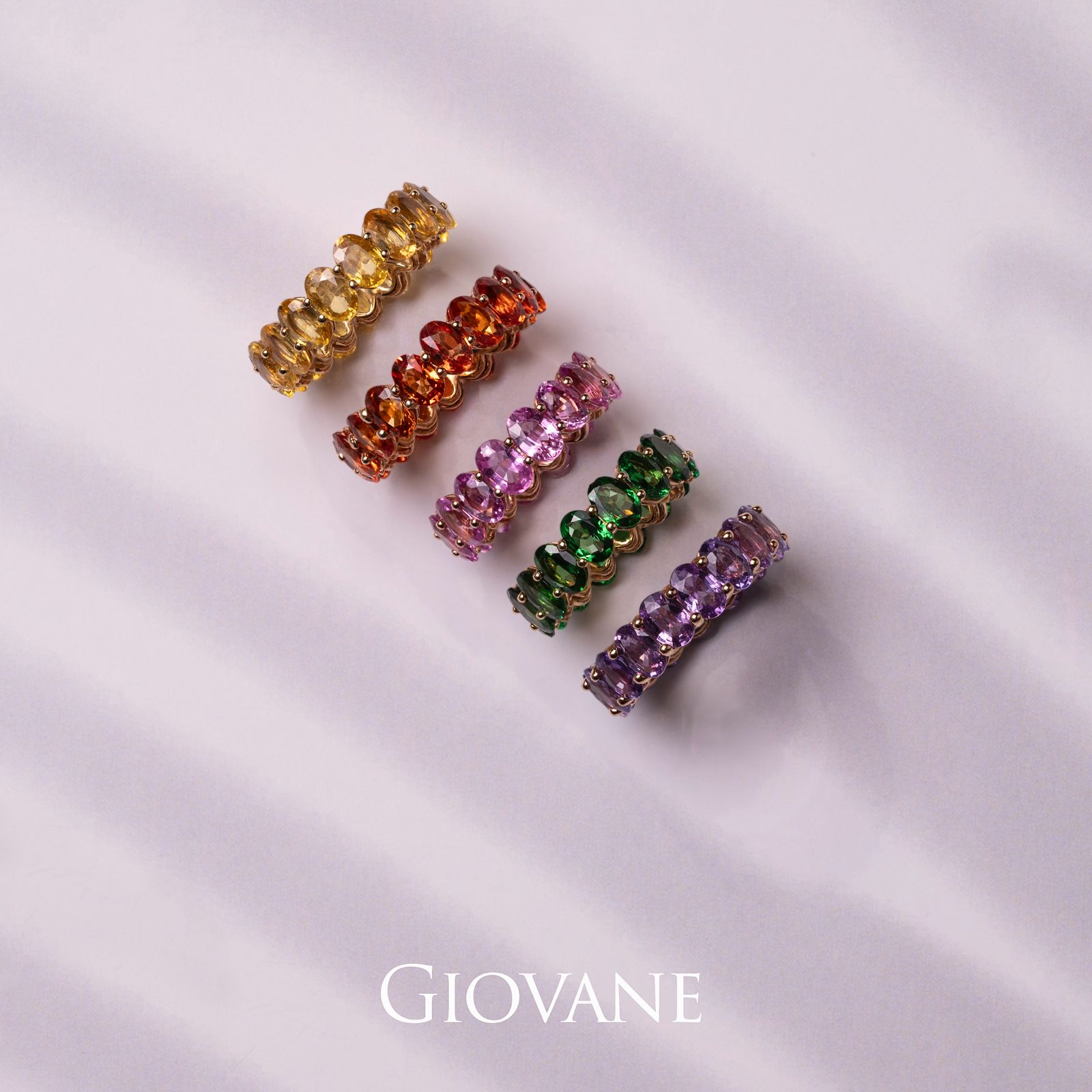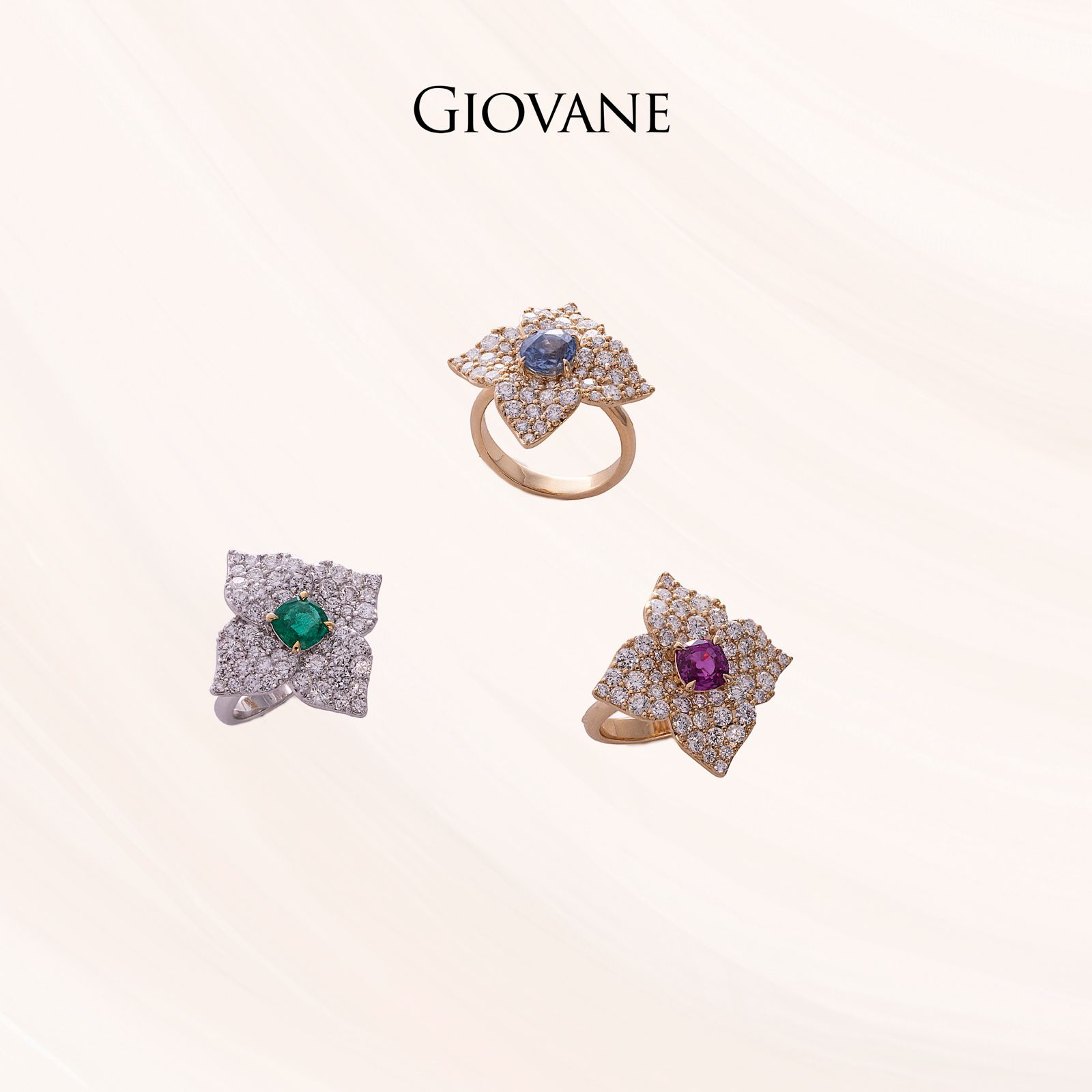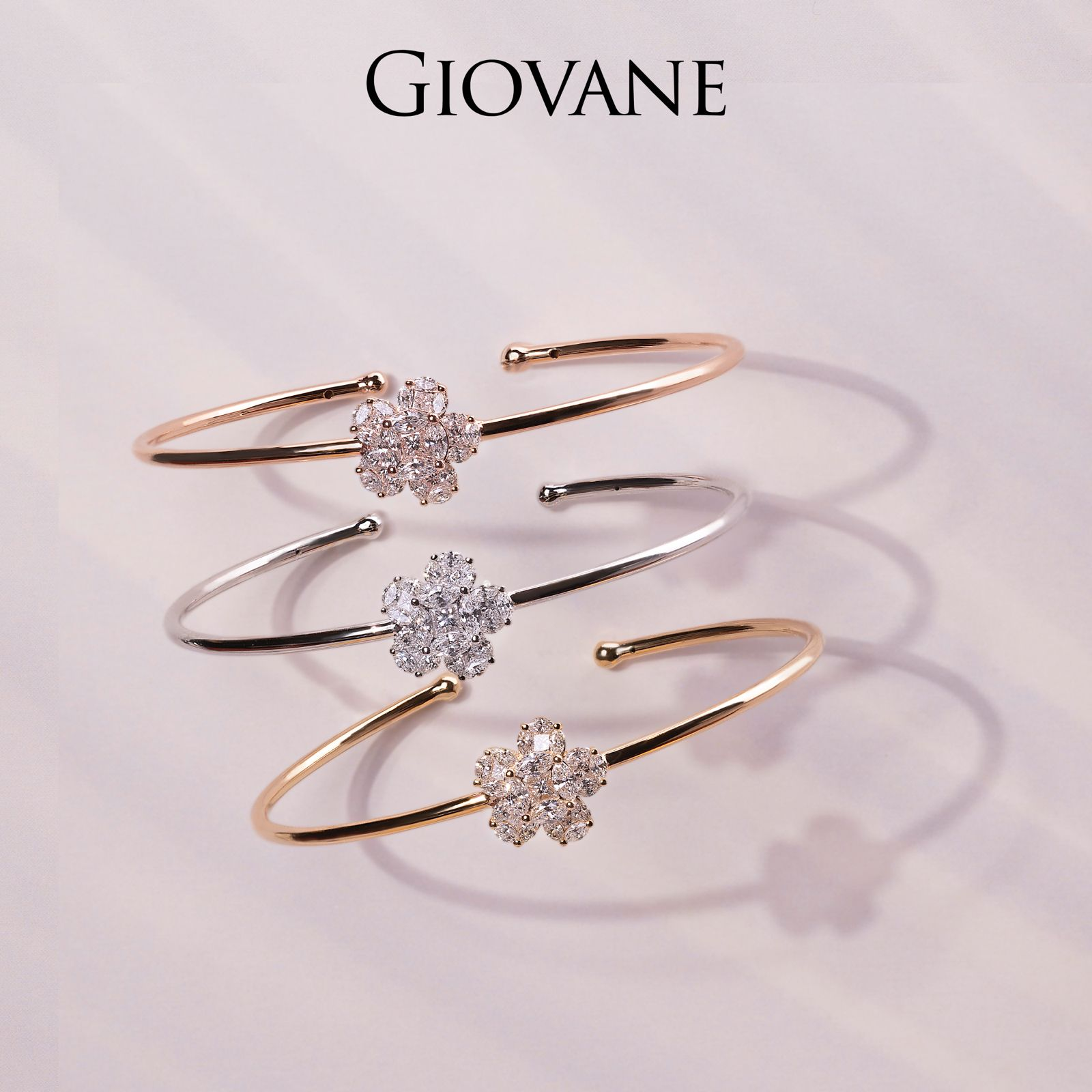 Beautiful modern designs for a necklace, bracelet and ring playing with the three colours of gold: white, yellow